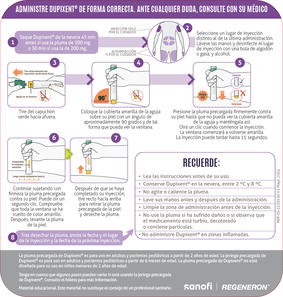 *La pluma precargada de dupilumab es para uso en adultos y pacientes pediátricos a partir de 2 años de edad. La jeringa precargada de dupilumab es parauso en adultos y pacientes pediátricos a partir de 6 meses de edad. La pluma precargada de dupilumab no está diseñada para su uso en niños menores de 2años de edad. Contacte con su médico, quien le recetará la jeringa forma de administración adecuada.